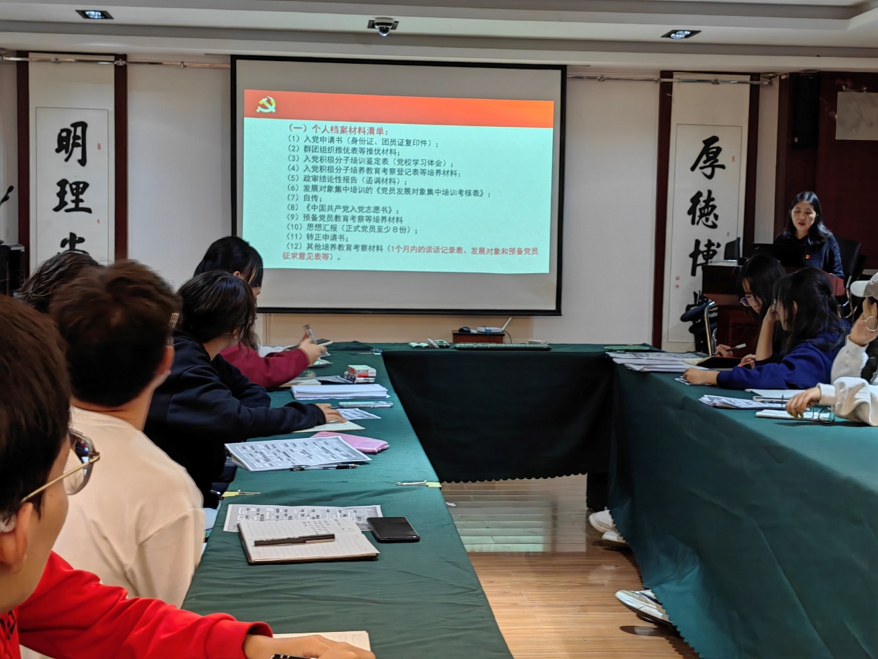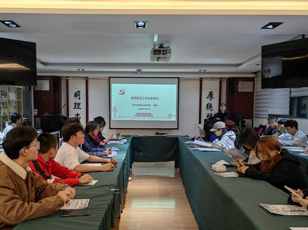 为深入学习贯彻习近平新时代中国特色社会主义思想,认真贯彻落实《中国共产党章程》和《中国共产党发展党员工作细则》等有关要求,进一步加强对党务工作人员的业务培训,不断提升学院发展党员质量,公司党委于2023年10月7日在尚农楼304会议室举行发展党员工作业务培训,参加培训人员有学院团委书记、党政办公室工作人员、各支部支委、各班团支书、党建先锋队员等相关人员。