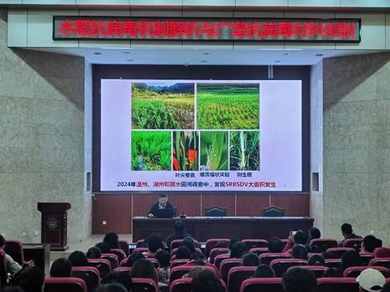 水稻作为全球重要粮食作物,一旦遭受病毒侵害将对粮食安全产生重大影响。孙宗涛研究员在详细解析水稻抗病毒机制时,运用了大量的研究数据和图表深入浅出地讲解了水稻自身免疫系统的工作原理,包括水稻是如何识别病毒入侵信号、启动防御反应等关键环节,让师生们对这一复杂的生物过程有了更清晰的认识。接着,他分享了团队在广谱抗病毒材料创制方面的最新成果。基因编辑技术结合传统育种方法的改良等新品种创制方法在实践中展现出了巨大的应用潜力,为培育出抗病毒能力强的水稻品种提供了新思路。