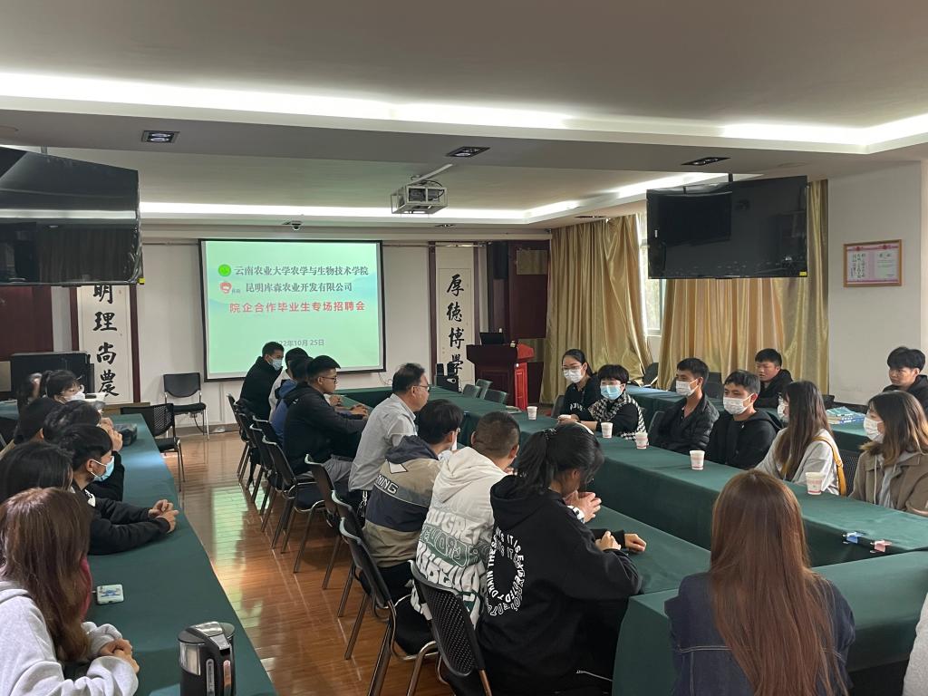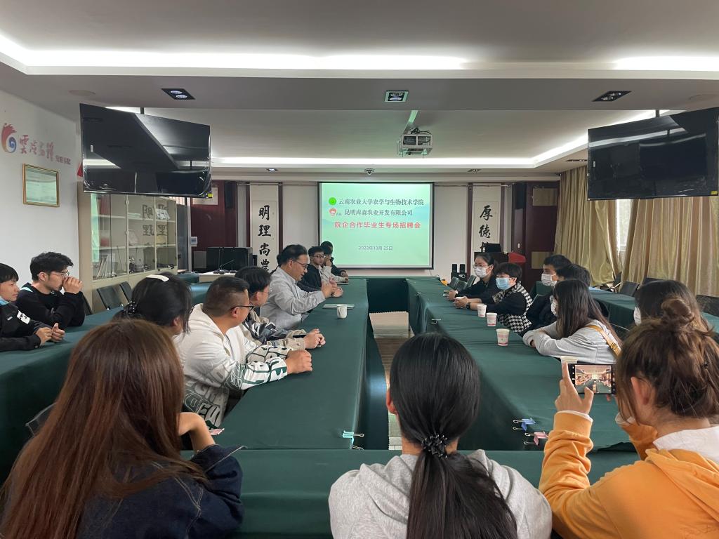 2022年10月25日,公司合作企业昆明库森农业开发有限公司进行“院企合作毕业生专场招聘会”,会议由学院副书记安曈昕老师主持。会上安老师与昆明库森农业开发有限公司负责人赵朝琼进行了详细会谈,逐一了解企业的用工需求、招聘要求、及提供的工资待遇等方面问题。同时还有公司40名应届生参会,会上昆明库森农业开发有限公司员工(公司2018级员工)与40名应届生进行了热烈讨论与交流,一一回答同学们关心的各类问题,切实解决同学们的疑问与要求。