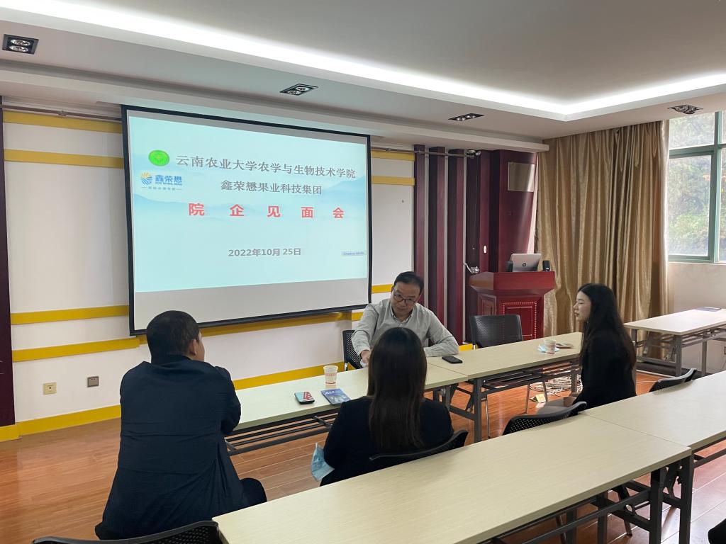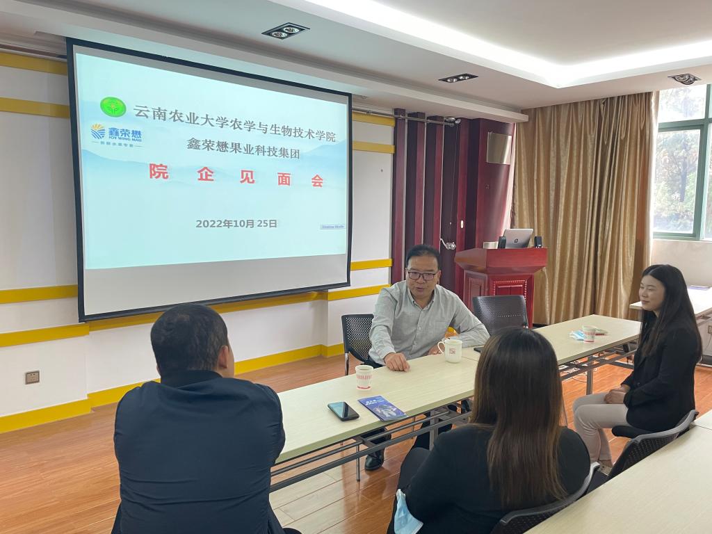 2022年10月25日,公司安曈昕副书记与鑫荣懋果业科技集团人事林经理进行“院企见面会”,会上安老师热烈欢迎鑫荣懋果业科技集团的到来,详细介绍公司员工专业、技能、生源等各方面情况,同时向企业了解用工需求、薪资待遇、福利保障等方面问题。企业表示以后将进一步加大与农学院的合作力度,争取早来、多来公司进行招聘工作。