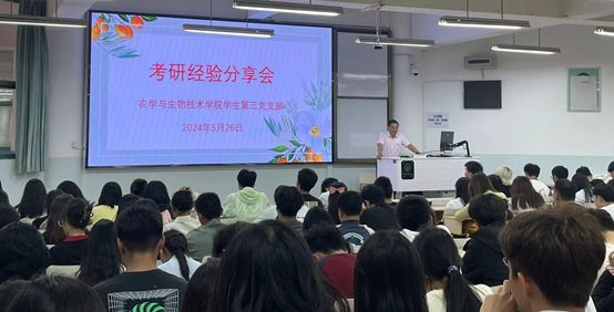 2024526日,bevitor伟德国际1946员工第三党支部在尚农楼1-18召开了考研经验分享会,旨在帮助低年级同学深入了解考研过程,激发同学们的考研热情,做到学习帮扶。除支部党员同志外,还有2021级、2022级及2023级种子科学工程专业有考研意向的同学共180余人参加了本次活动。