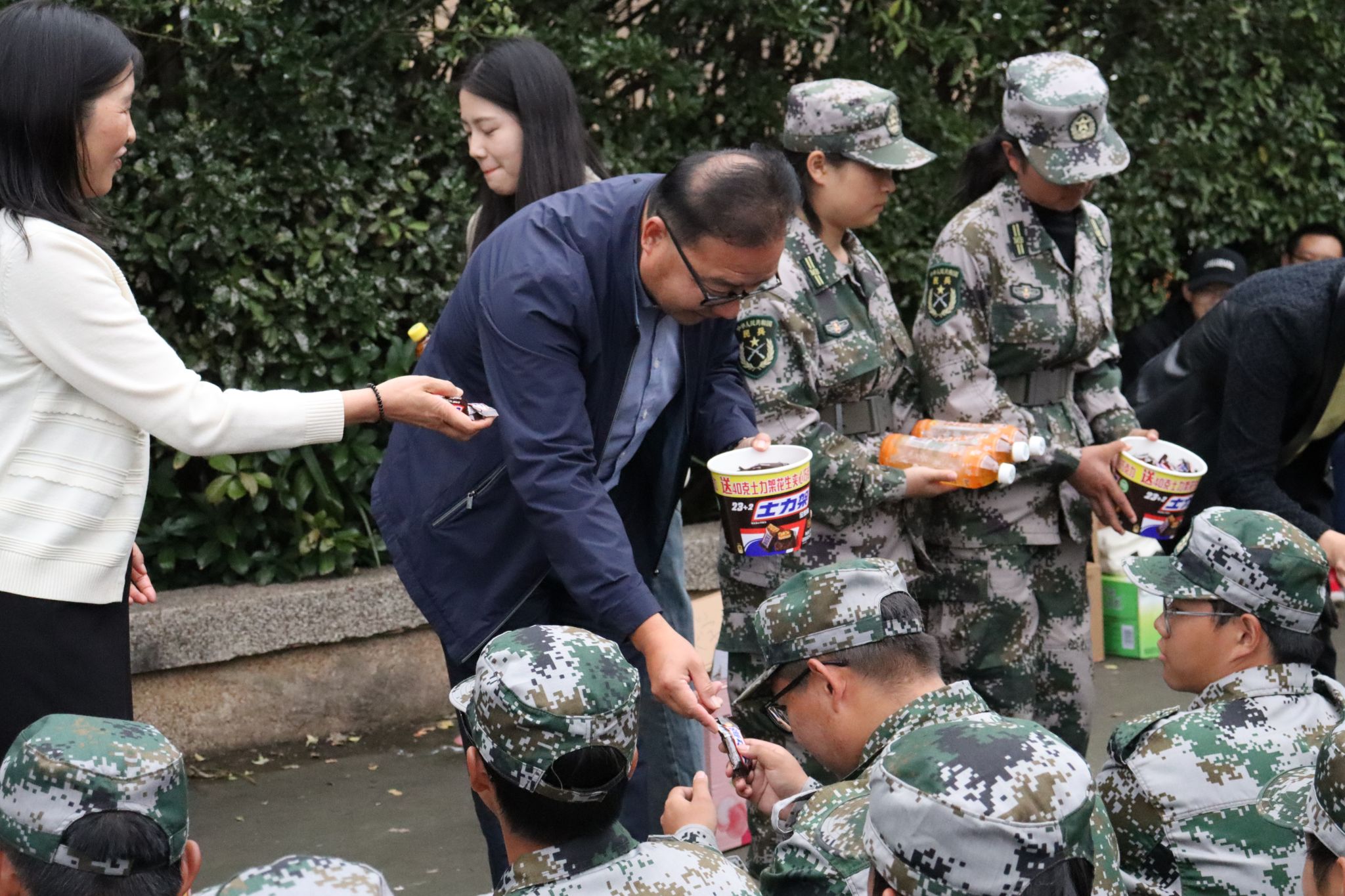 1022日下午四点,公司党委副书记安曈昕老师、党委组织员寸湘琴老师、新生班主任、辅导员代表学院前往田径场慰问正在军训的2024级新生。