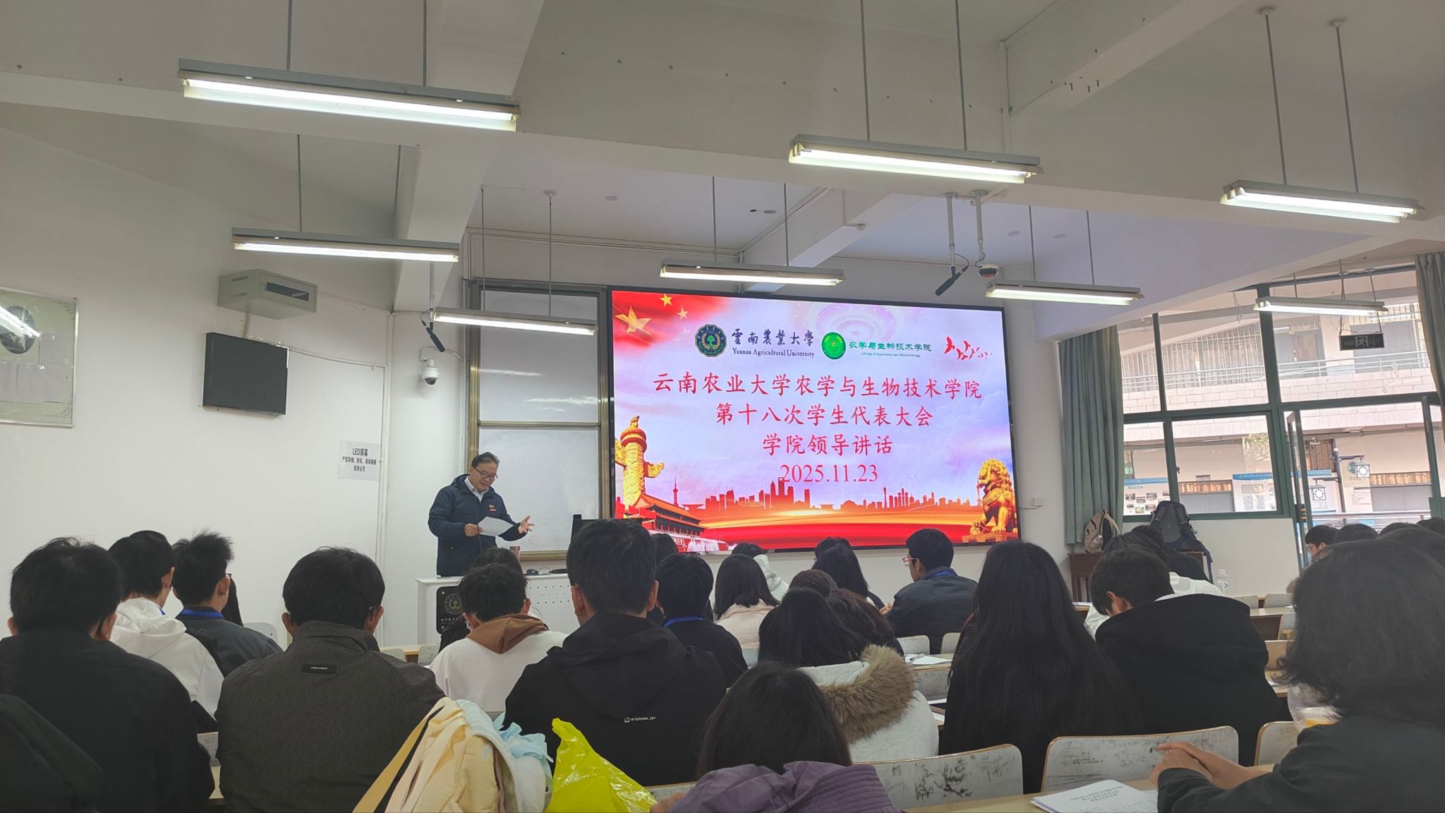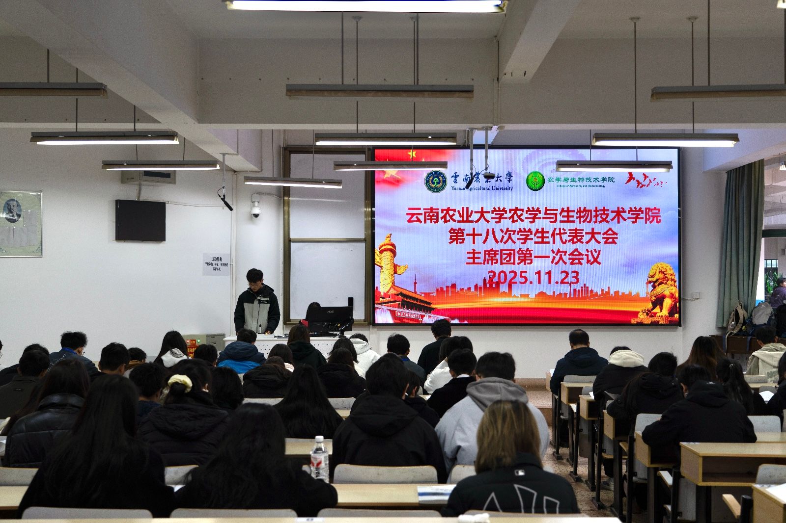 11月23日上午,大会在雄壮的中华人民共和国国歌声中正式开幕。公司党委副书记安曈昕、学院团学教师、辅导员及来自各年级、各班级的代表齐聚一堂,共同见证这一青春盛会。会议现场氛围庄重而热烈。