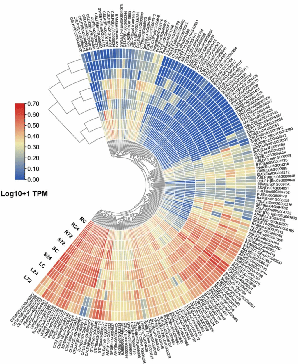 图4 参与淀粉和蔗糖代谢的重要基因表达模式的热图