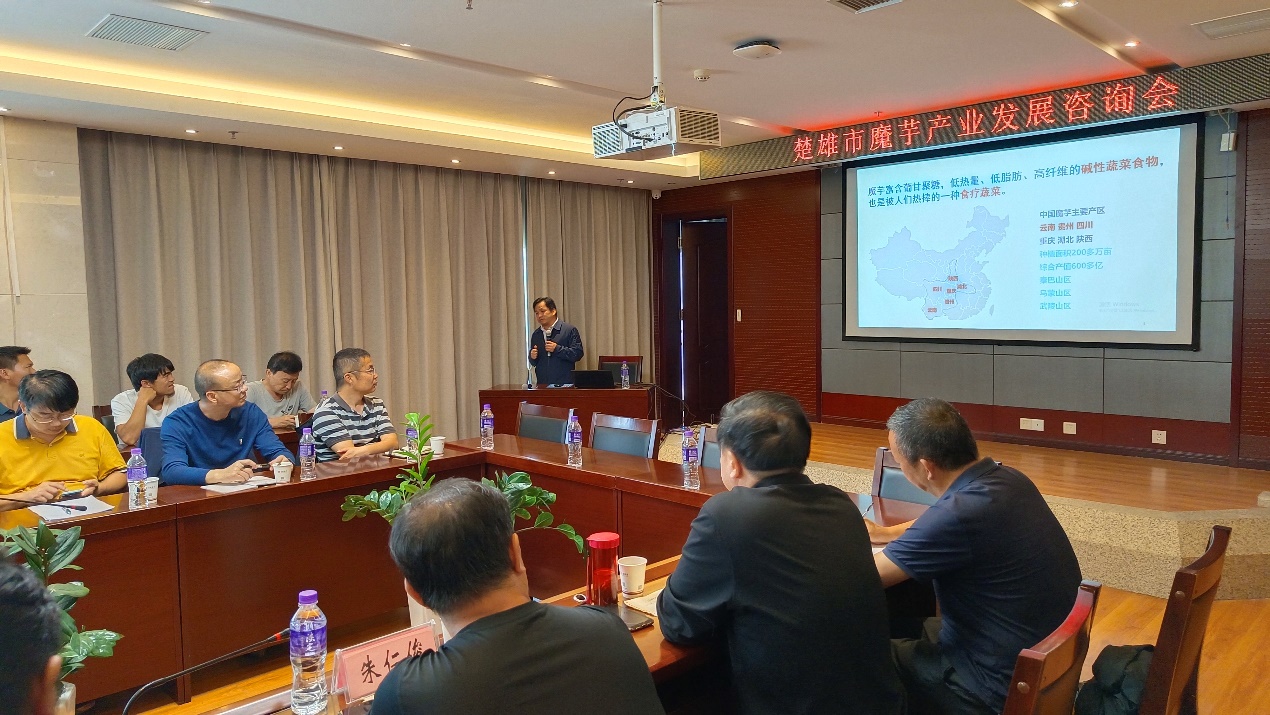 在楚雄市魔芋产业发展咨询会上,陈军文围绕着魔芋资源分布情况、魔芋产业发展现状、魔芋产业目前存在的问题、魔芋产业发展建议等方面首先进行了咨询汇报。在观摩和听取汇报后,王立新强调,科技特派团首先要精准定位自身的工作任务和使命,认真学习贯彻习近平总书记关于科技特派员制度重要论述精神,他指出,楚雄魔芋产业发展优势明显,要稳抓生产,依托科技特派团的技术力量和技术服务,切实推动楚雄市魔芋产业高质量发展。他还强调,科技特派团要真正做到“科技下乡,人才下沉”,服务地方特色产业。杨生超在作总结讲话时强调,科技特派团是一种新型的农业社会化服务体系,魔芋起源于中国,种植历史悠久,楚雄魔芋产业基础和发展前景良好。他希望楚雄市在魔芋产业“大分散,小聚集”的背景下,魔芋产业应该定位准确,精准布局,进行魔芋良种繁育,主抓关键技术创新,形成优势产区,形成比较优势,让技术创新引领魔芋产业高质量发展。